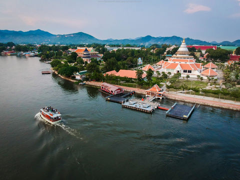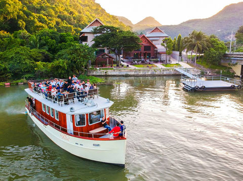 ชมภาพบรรยายกาศทั้งกิจกรรมล่องเรือทานอาหารบนแม่น้ำแม่กลองชมวิถีสองฝั่งแม่น้ำในกาญจนบุรี